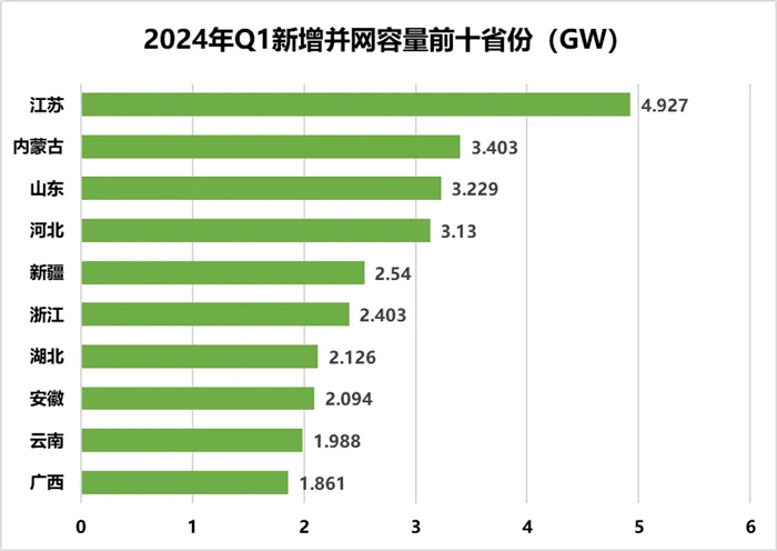 从省份来看,2024年一季度光伏新增并网容量排名前十的省份为:江苏4.927GW、内蒙古3.403GW、山东3.229GW、河北3.13GW、新疆2.54GW、浙江2.403GW、湖北2.126GW、安徽2.094GW、云南1.988GW、广西1.861GW。