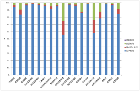 其中生产阶段的贡献最大,在18项指标中有13项指标的贡献比例超过90%。使用阶段对环境的影响可忽略,只有2项指标的贡献比例超过0.1%。
