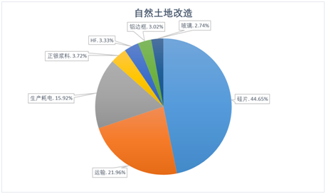 环境影响类别自然土地改造,以为单位,其中生产阶段产生1.37E-06m2,占比78.34%;安装阶段产生2.16E-07m2,占比12.40%;使用阶段产生2.93E-10m2,占比0.02%;寿命终止阶段产生1.61E-07m2,占比9.24%。在整个生命周期中,占比超过1%的子类别如图 3‑20所示,其中:硅片占比44.65%,运输占比21.96%,生产耗电占比15.92%,正银浆料占比3.72%,氢氟酸占比3.33%,铝边框占比3.02%,玻璃占比2.74%。