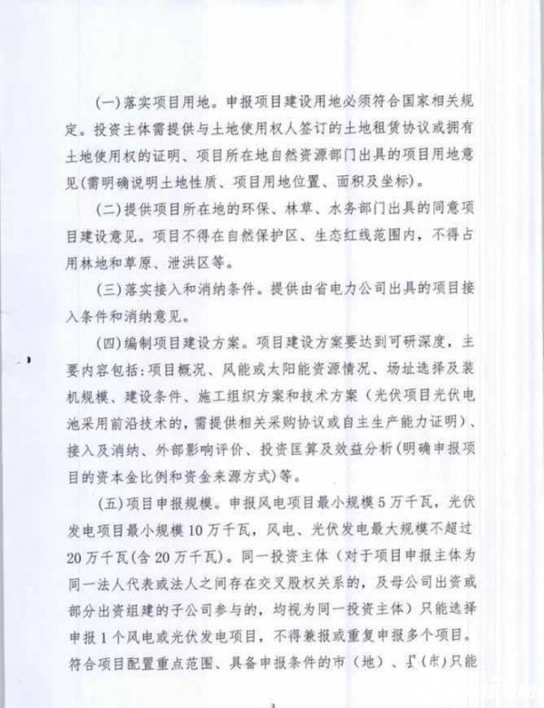 通知要求,风电项目最低申报规模不得低于50MW,光伏不得低于100MW,最大规模不得超过200MW。同一投资主体只能申报1个风电场或光伏项目,投资主体须在2020年底前开工,支持存量项目转平价,报送截止日期为4月30日。